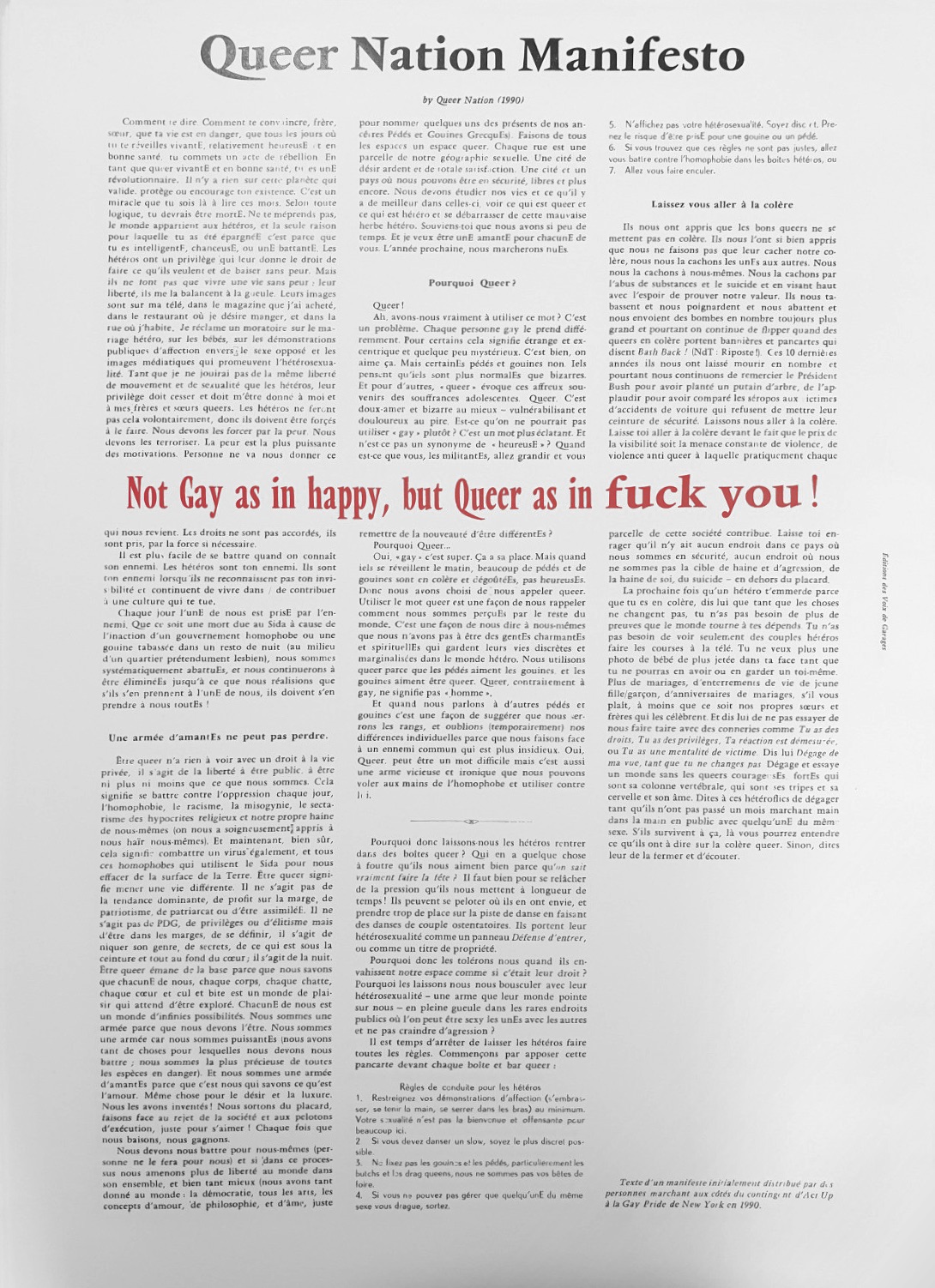 The Queer Nation Manifesto is a manifest distributed by people walking with the Act Up group during the New York Gay Pride of 1990. It originated the Queer Nation mouvement across the USA.