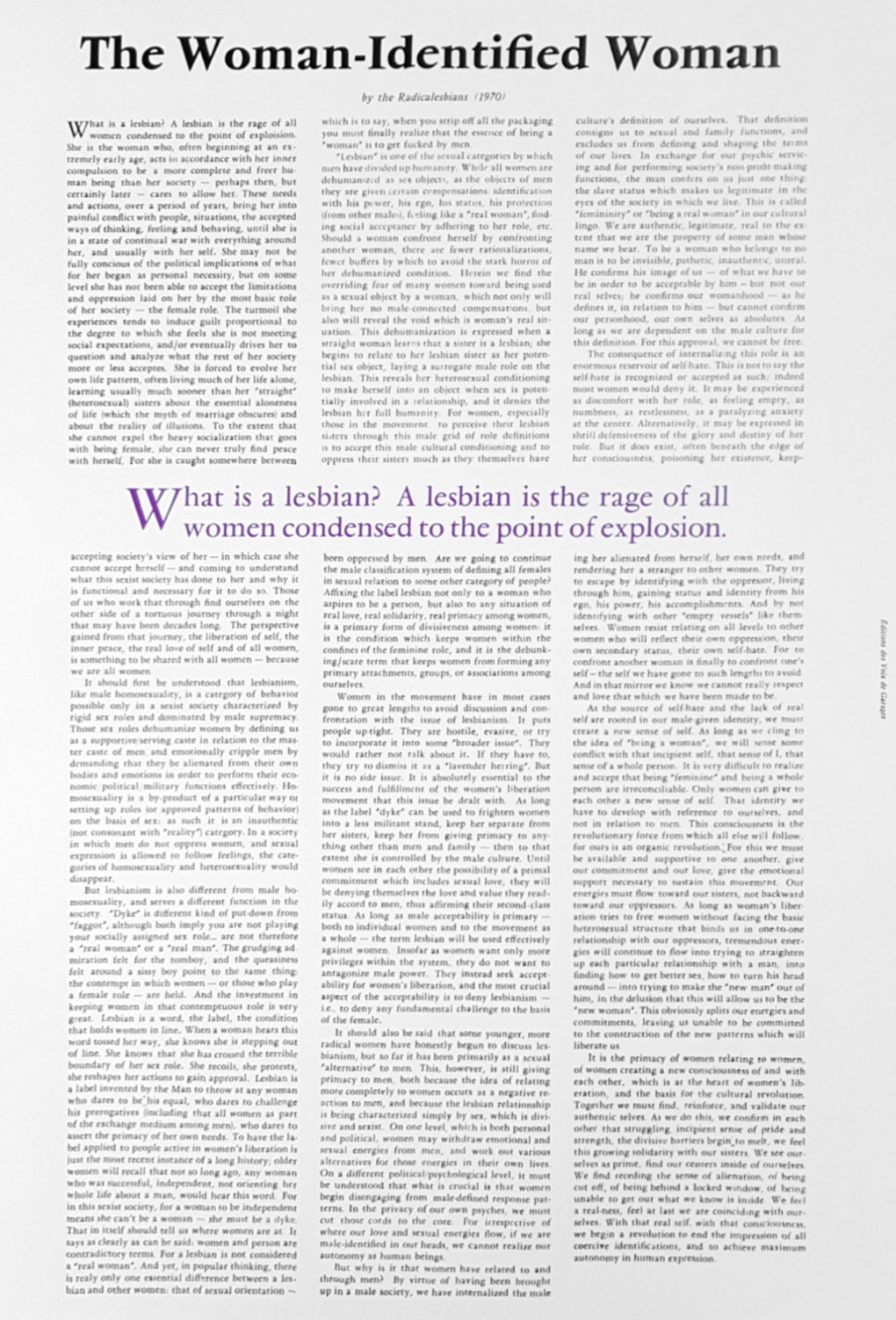 As for the Woman-Identified Woman, the text was composed in Vendôme font, letter by letter. We printed extract of the text, using the French translation from Infokiosques.net.